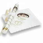 Ten wyjątkowy zestaw wyróżnia się możliwością umieszczenia zdjęcia dziecka na świecy oraz wiersza, dedykacji lub cytatu na szatce.