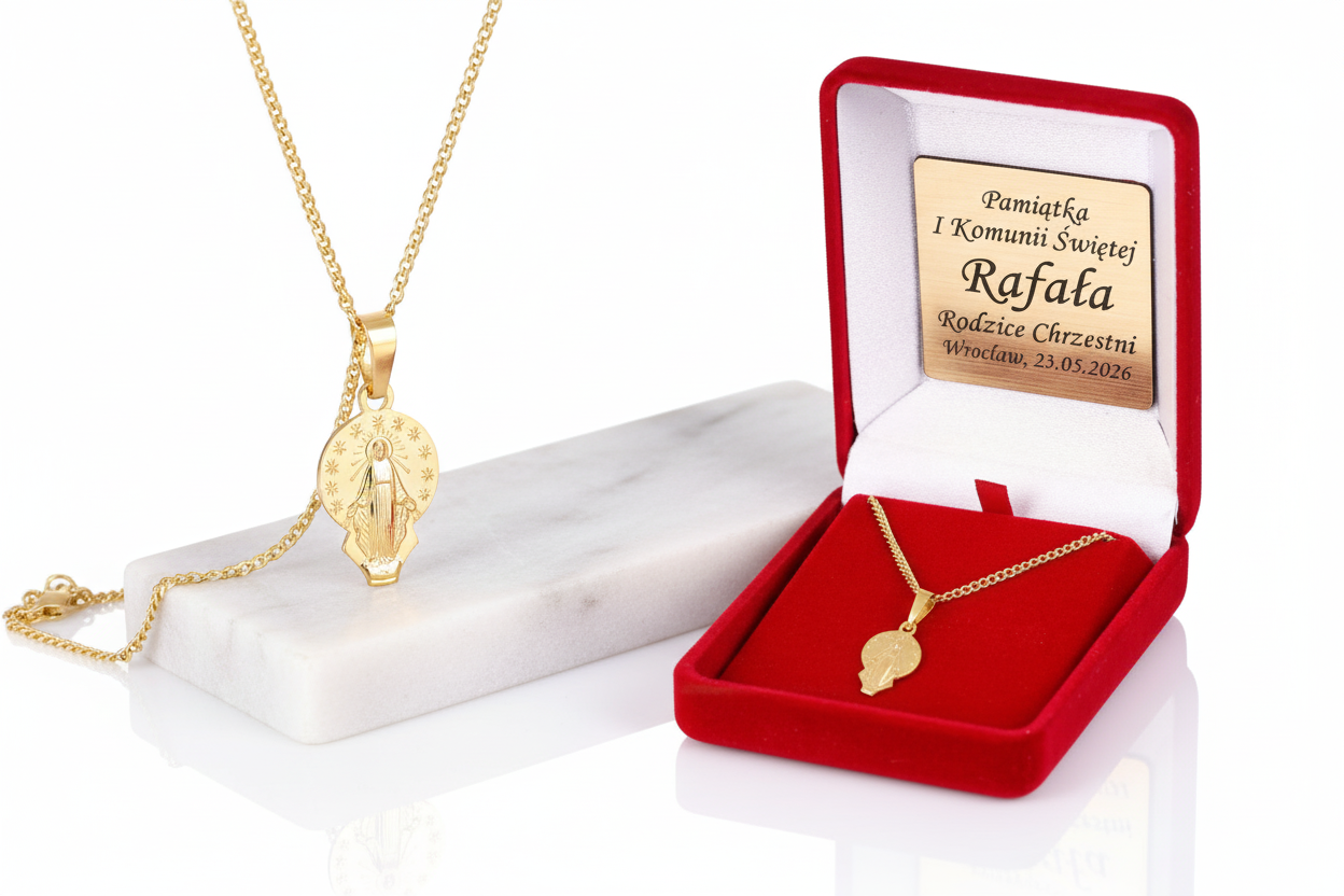 Zestaw obejmuje medalik i łańcuszek w ozdobnym pudełku prezentowym z możliwością dodania dedykacji – trwałego graweru laserowego lub nadruku Ink-Jet na wieku. Możesz umieścić imię, datę, błogosławieństwo lub cytat maryjny, tworząc osobisty dar wiary i wdzięczności.
