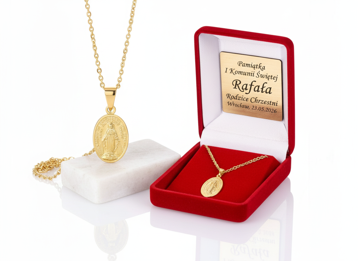 Złocony klasyczny Cudowny Medalik pr. 925 to ponadczasowy symbol wiary i opieki Matki Bożej Niepokalanej. W komplecie z łańcuszkiem i eleganckim pudełkiem z dedykacją – grawer lub nadruk Ink-Jet – stanowi piękną pamiątkę religijną i wyjątkowy prezent pełen duchowego znaczenia.
