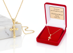 Wykonany z srebra próby 925 i pokryty warstwą 24-karatowego złota, krzyżyk emanuje subtelnym blaskiem, łącząc duchowość z elegancją. Jego klasyczny charakter czyni go idealnym prezentem dla osób wierzących, zarówno młodszych, jak i dorosłych.
