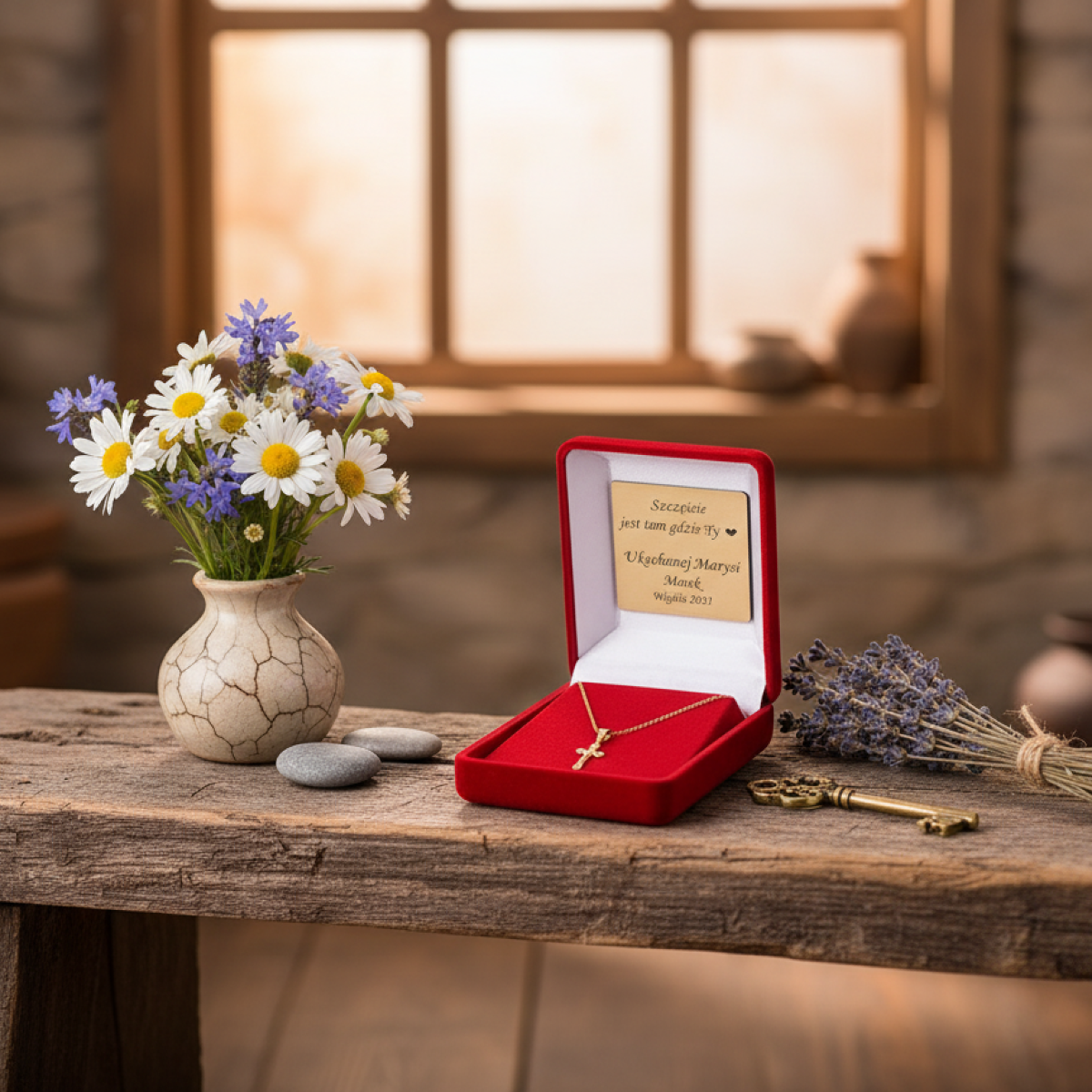 Komplet zawiera krzyżyk i łańcuszek w ozdobnym pudełku, które możesz spersonalizować za pomocą graweru laserowego lub nadruku Ink-Jet. Wybierz imię, cytat biblijny lub datę uroczystości, aby stworzyć osobisty dar wiary i wdzięczności.