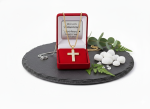 Komplet obejmuje krzyżyk i łańcuszek w eleganckim pudełku z możliwością wykonania dedykacji – trwałego graweru laserowego na metalowej tabliczce lub nadruku Ink-Jet bezpośrednio na wieku. Dedykacja nadaje biżuterii osobisty charakter i sprawia, że staje się ona pamiątką duchową o wyjątkowym znaczeniu.