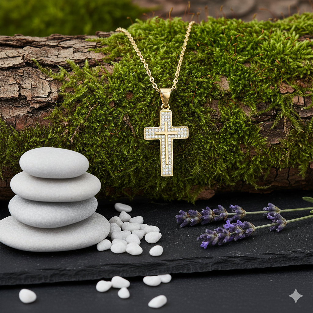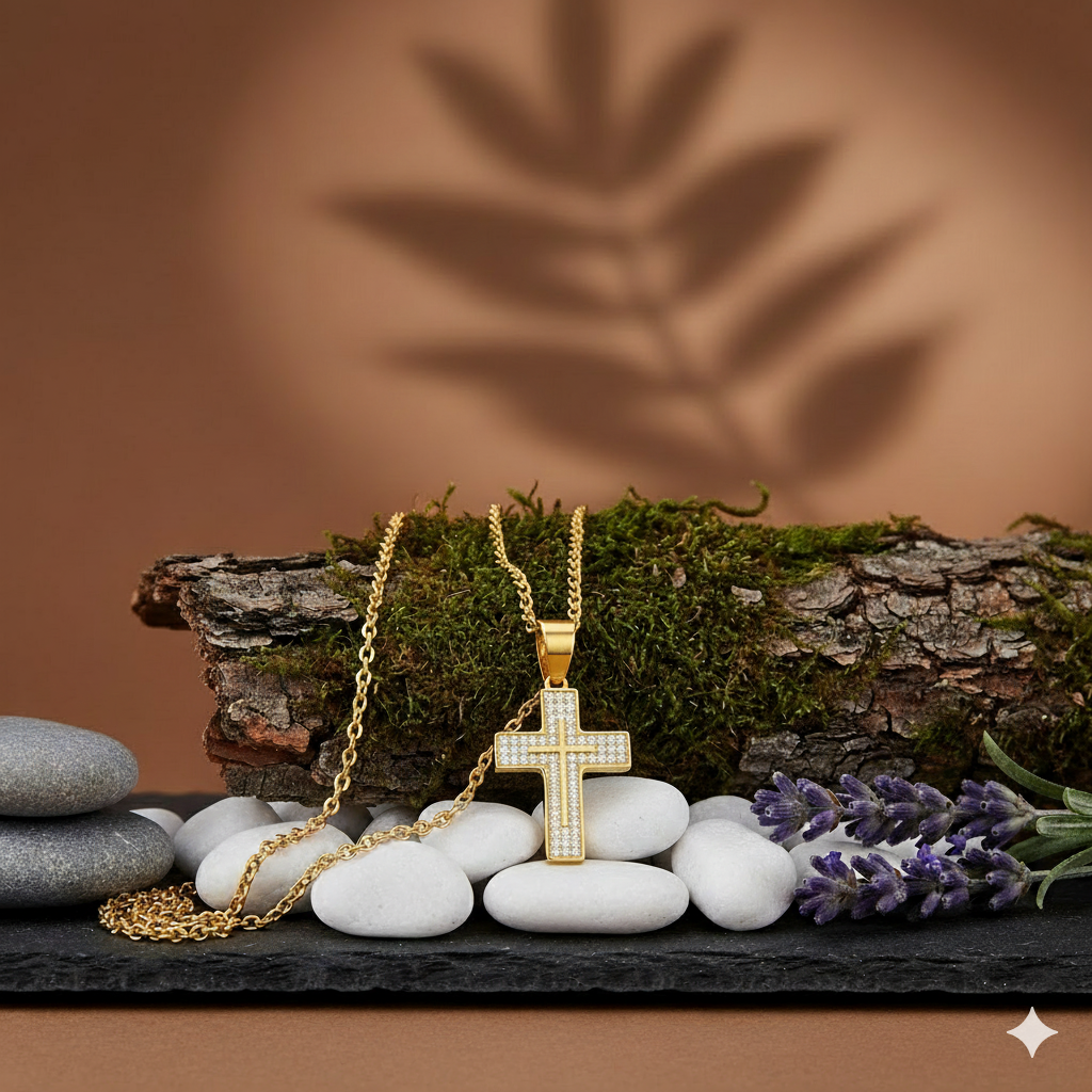 Blask cyrkonii symbolizuje Boże światło i łaskę, a złocona powierzchnia podkreśla szlachetność i trwałość wiary. To nie tylko ozdoba – to znak nadziei i duchowej ochrony, który można nosić każdego dnia.