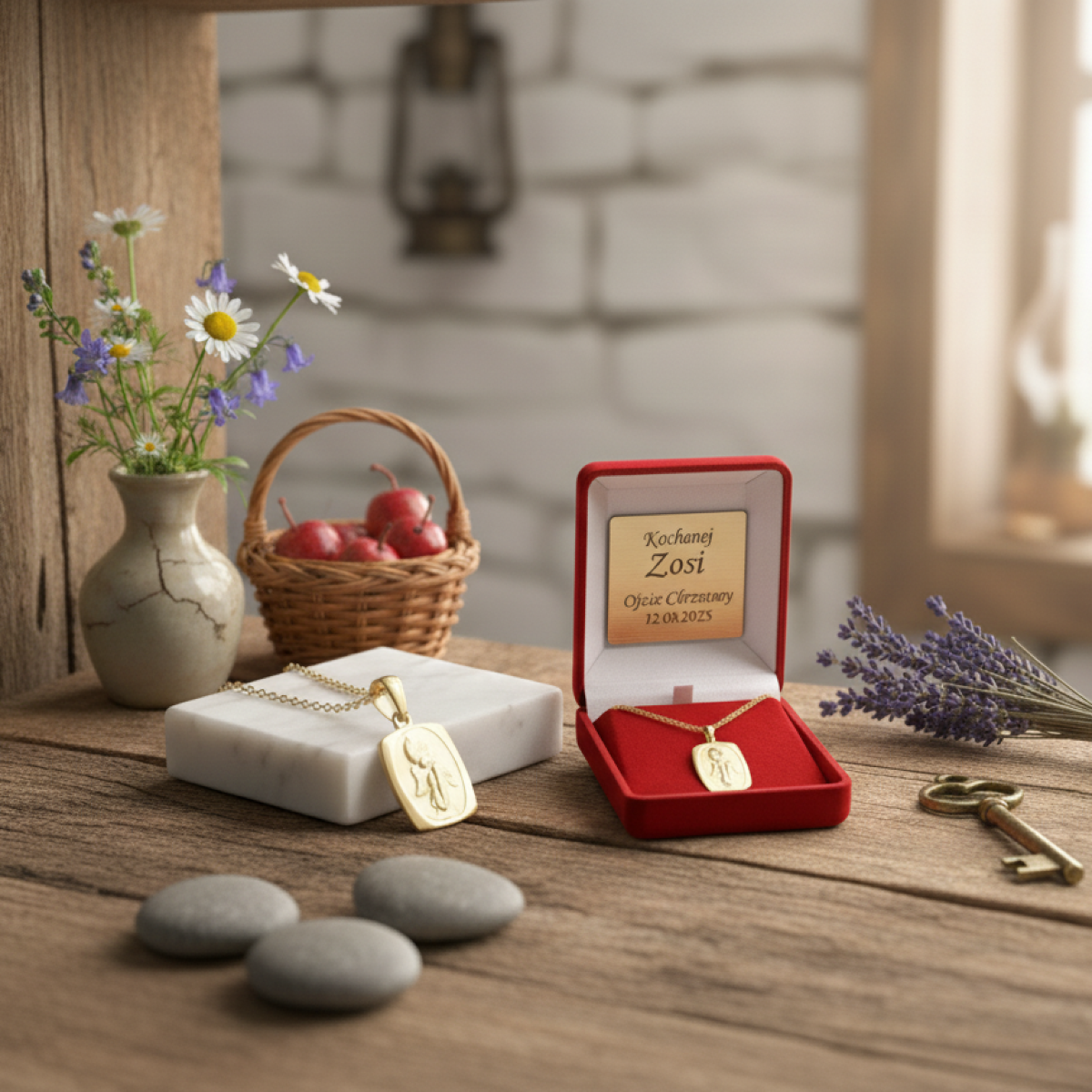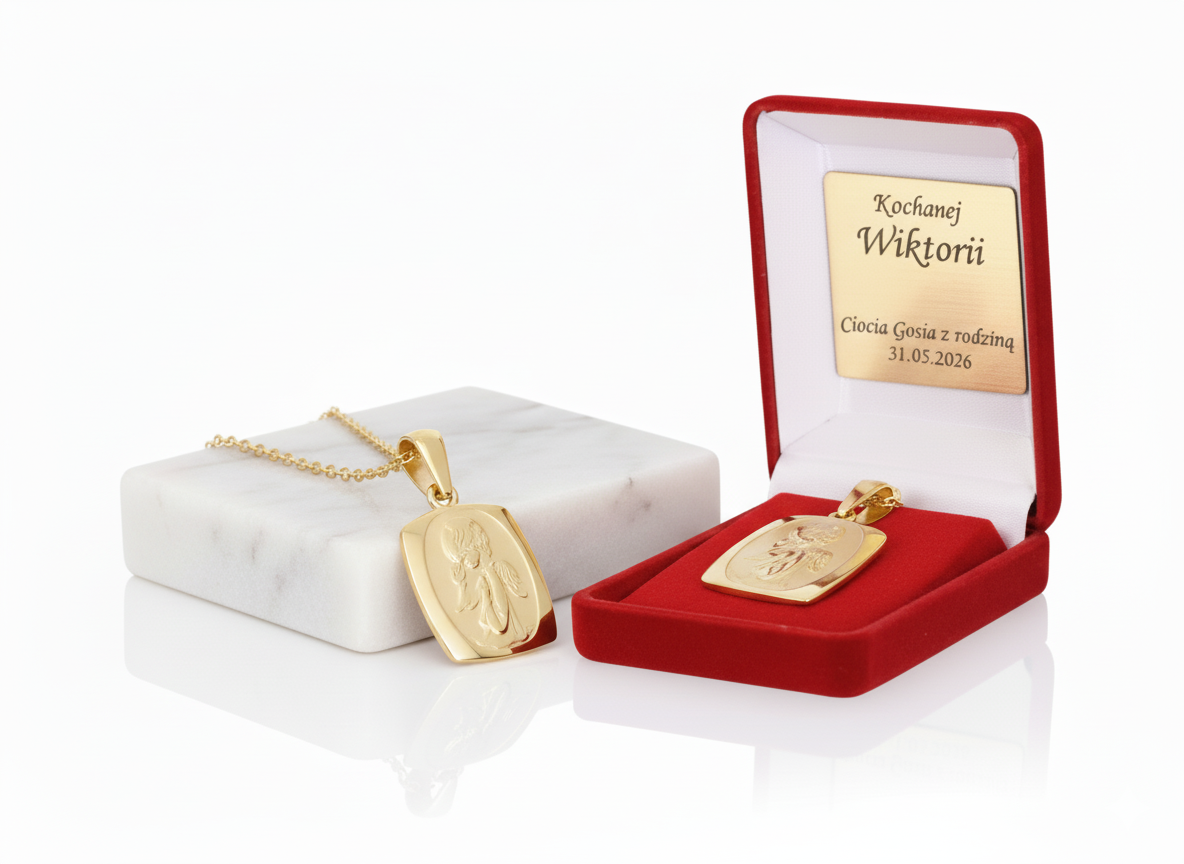 Zestaw obejmuje medalik i łańcuszek w eleganckim pudełku z możliwością dodania dedykacji – trwałego graweru laserowego lub nadruku Ink-Jet. Możesz umieścić imię, datę Chrztu, błogosławieństwo lub cytat modlitewny, by nadać upominkowi osobisty charakter.