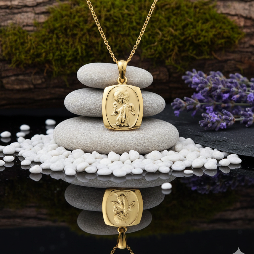 Wykonany ze srebra próby 925 pokrytego warstwą 24-karatowego złota, medalik łączy duchową symbolikę z elegancją. Złocenie podkreśla jego delikatność, a subtelny połysk dodaje uroku zarówno dziecięcej, jak i dorosłej biżuterii sakralnej.