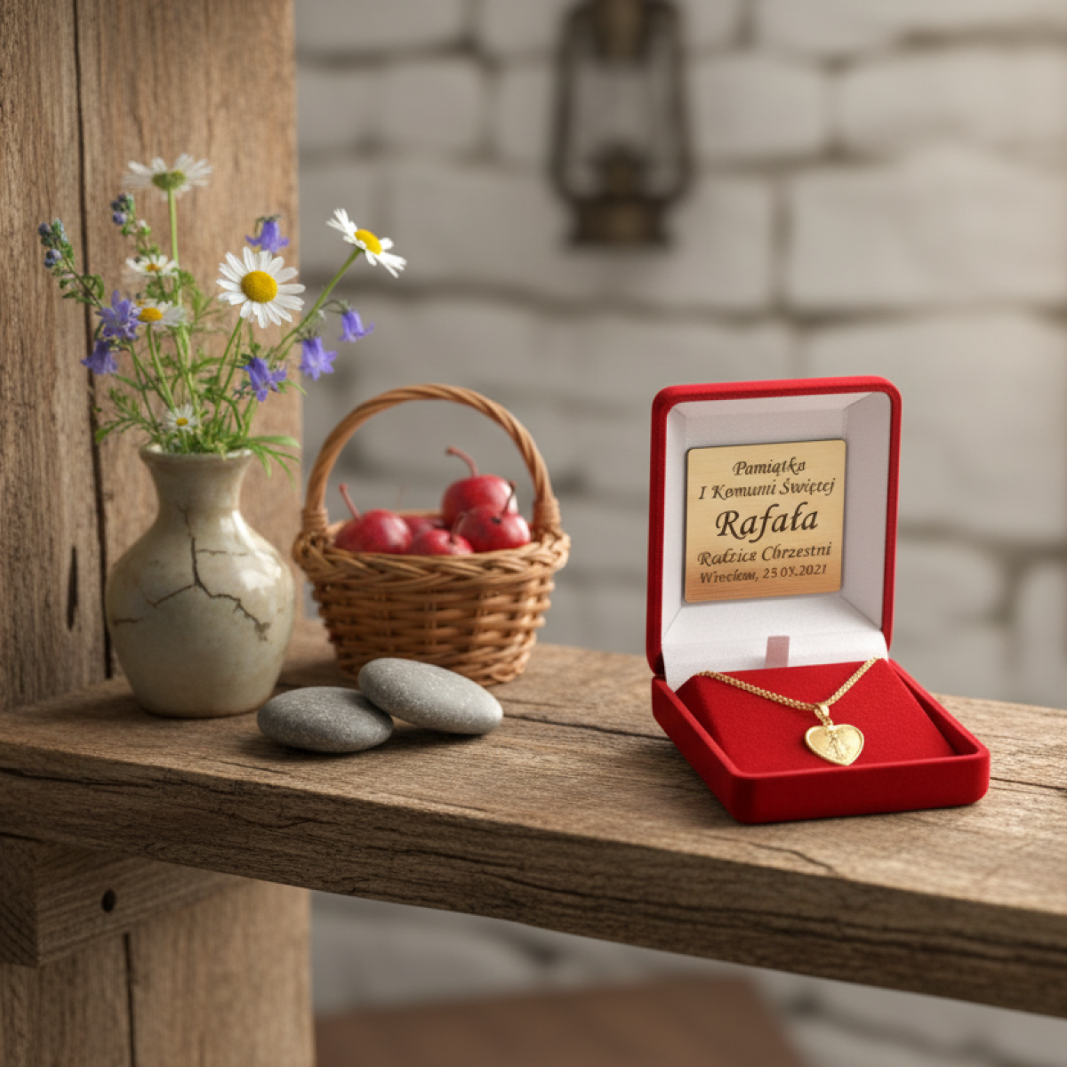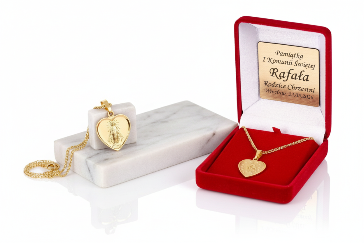 Komplet zawiera medalik i łańcuszek w eleganckim pudełku z możliwością dodania dedykacji – trwałego graweru laserowego na metalowej tabliczce lub nadruku Ink-Jet bezpośrednio na wieku. Możesz dodać imię, datę, modlitwę lub błogosławieństwo – tworząc osobisty dar wiary i wdzięczności.