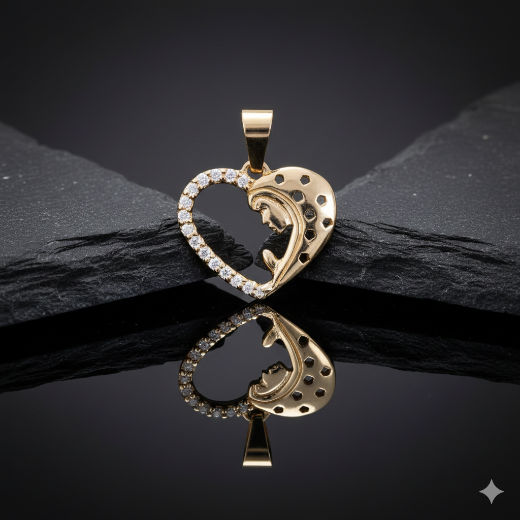Złoty medalik w kształcie serca z wizerunkiem Matki Boskiej modlącej, wykonany ze złota próby 585. Delikatna, symboliczna pamiątka Chrztu Świętego lub Pierwszej Komunii z możliwością personalizacji.
