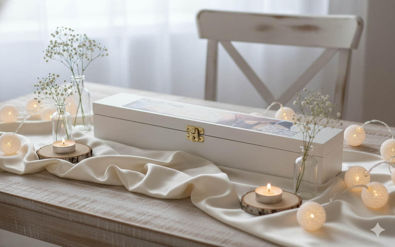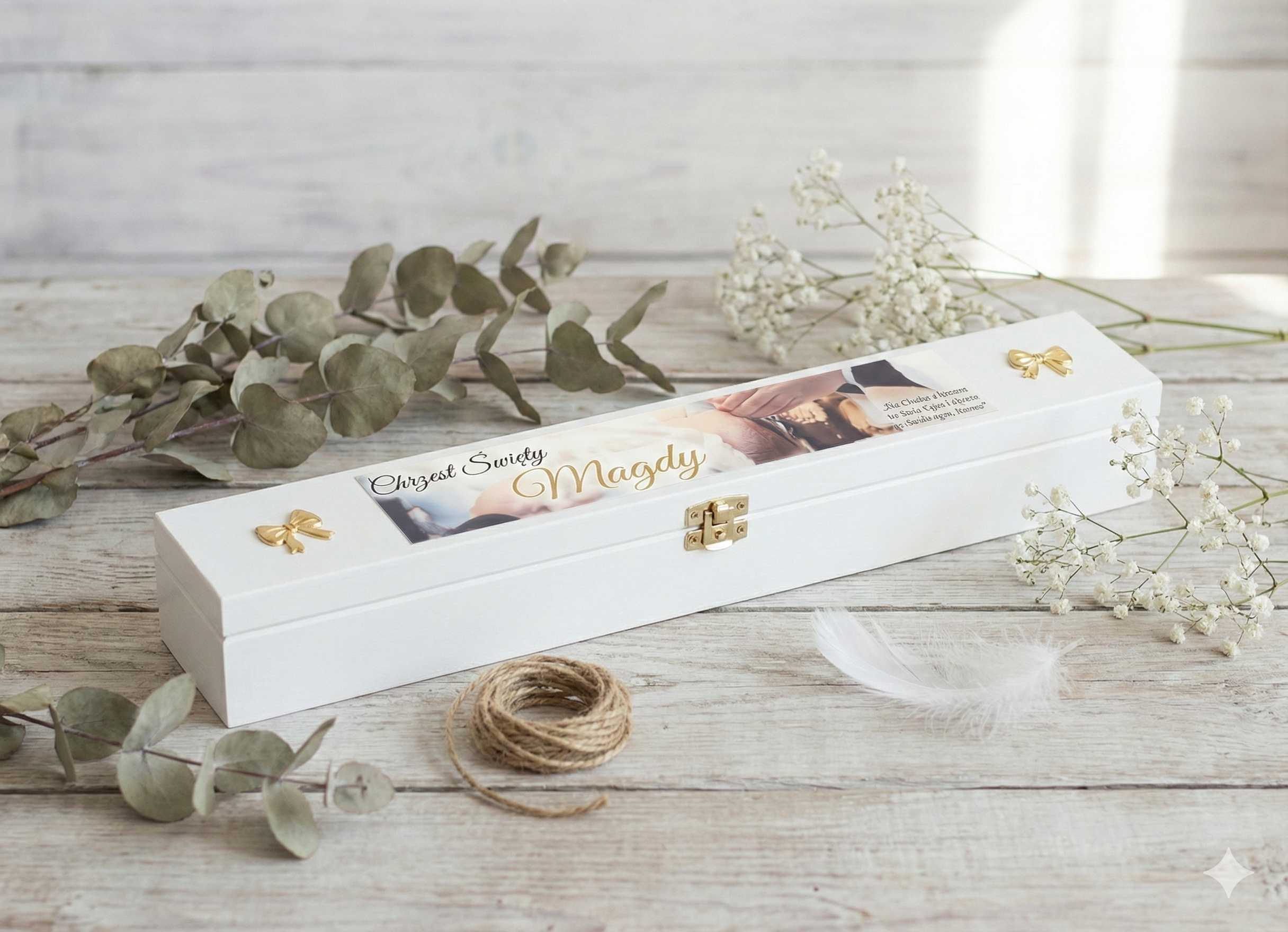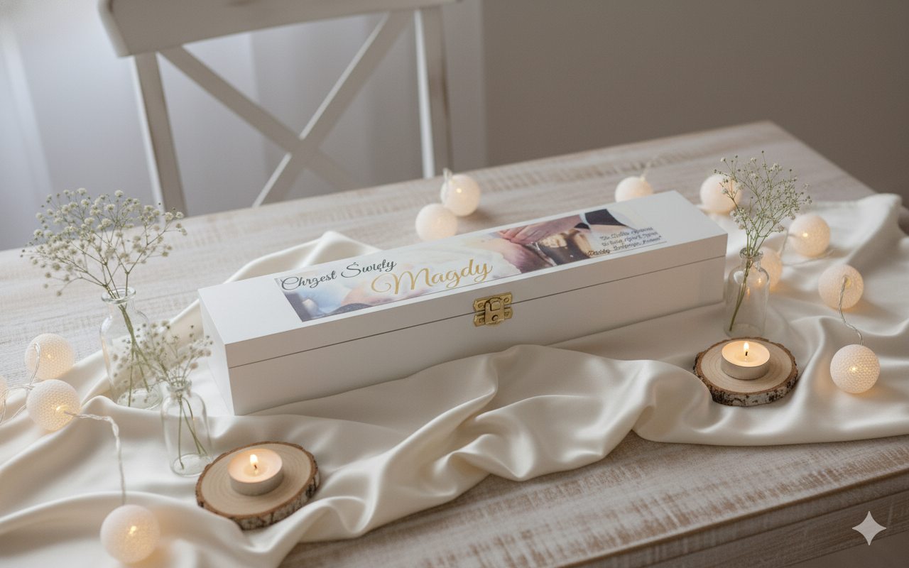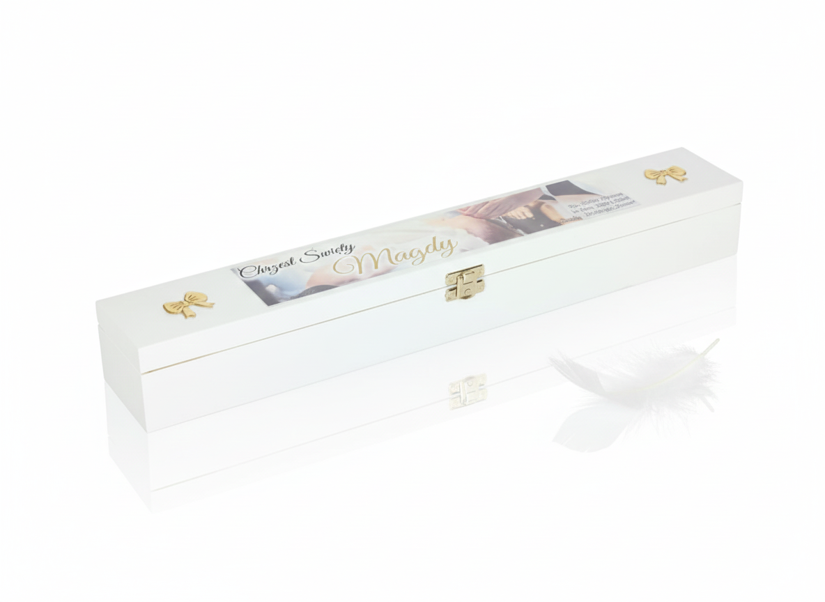 To wyjątkowe białe pudełko drewniane z motywem „Chrzest” zostało zaprojektowane z myślą o duchowym pięknie i czystości tego sakramentu. Delikatny nadruk wykonany w technologii Ink-Jet przedstawia symboliczną scenę dziecka podczas ceremonii chrztu – subtelne ujęcie momentu, w którym łaska Boża dotyka nowego życia. Biel drewna i pastelowe tło nadają pamiątce elegancji i spokoju.