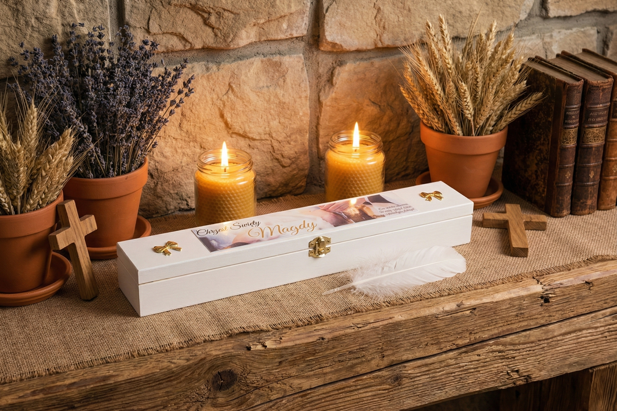 Stwórz spójny zestaw pamiątkowy na Chrzest lub Komunię – wybierz świecę pasującą stylem do pudełka.