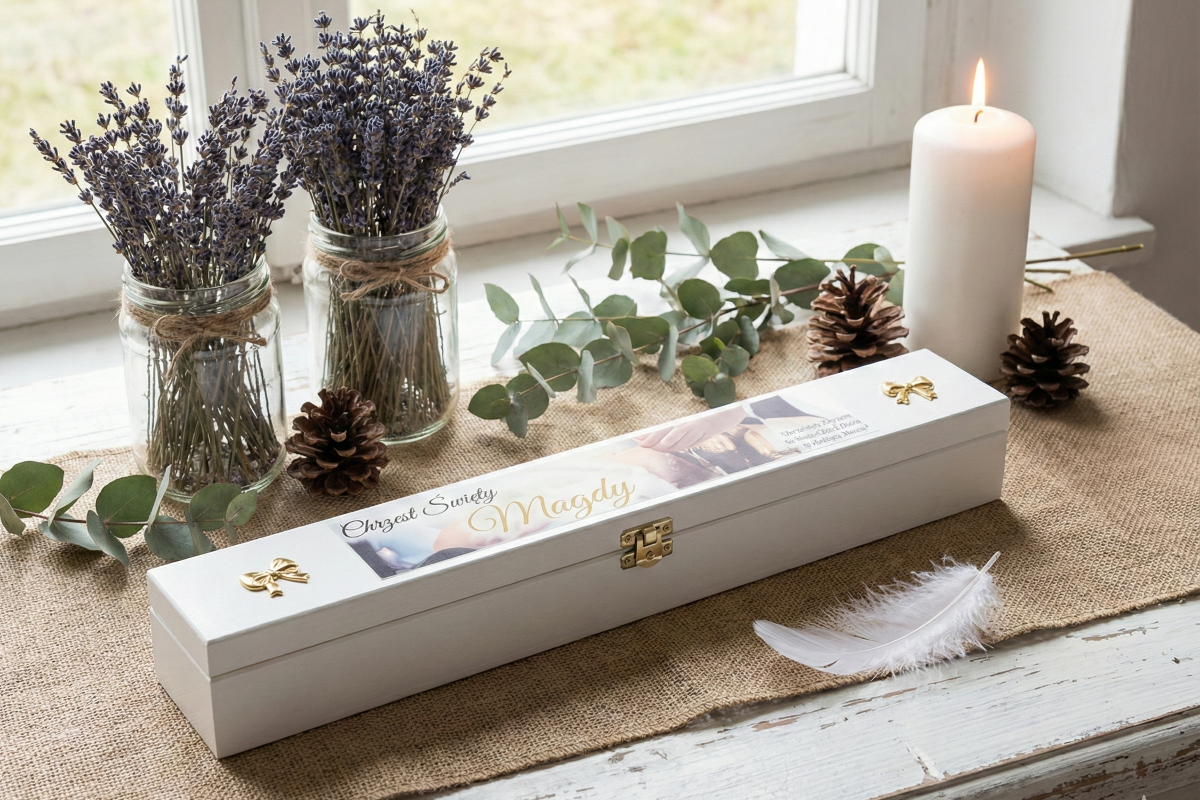 Każde pudełko powstaje w naszej polskiej pracowni, gdzie tradycja rzemiosła spotyka się z nowoczesną technologią druku Ink-Jet. Stosujemy wyłącznie drewno wysokiej jakości i ekologiczne farby, by stworzyć produkt trwały, bezpieczny i pełen duchowego znaczenia. To pamiątka, która zachowa wspomnienie Chrztu Świętego przez wiele lat.