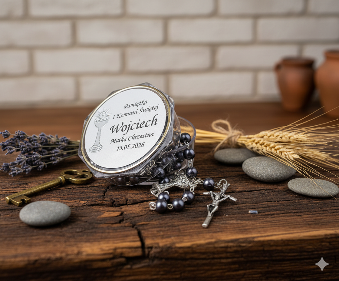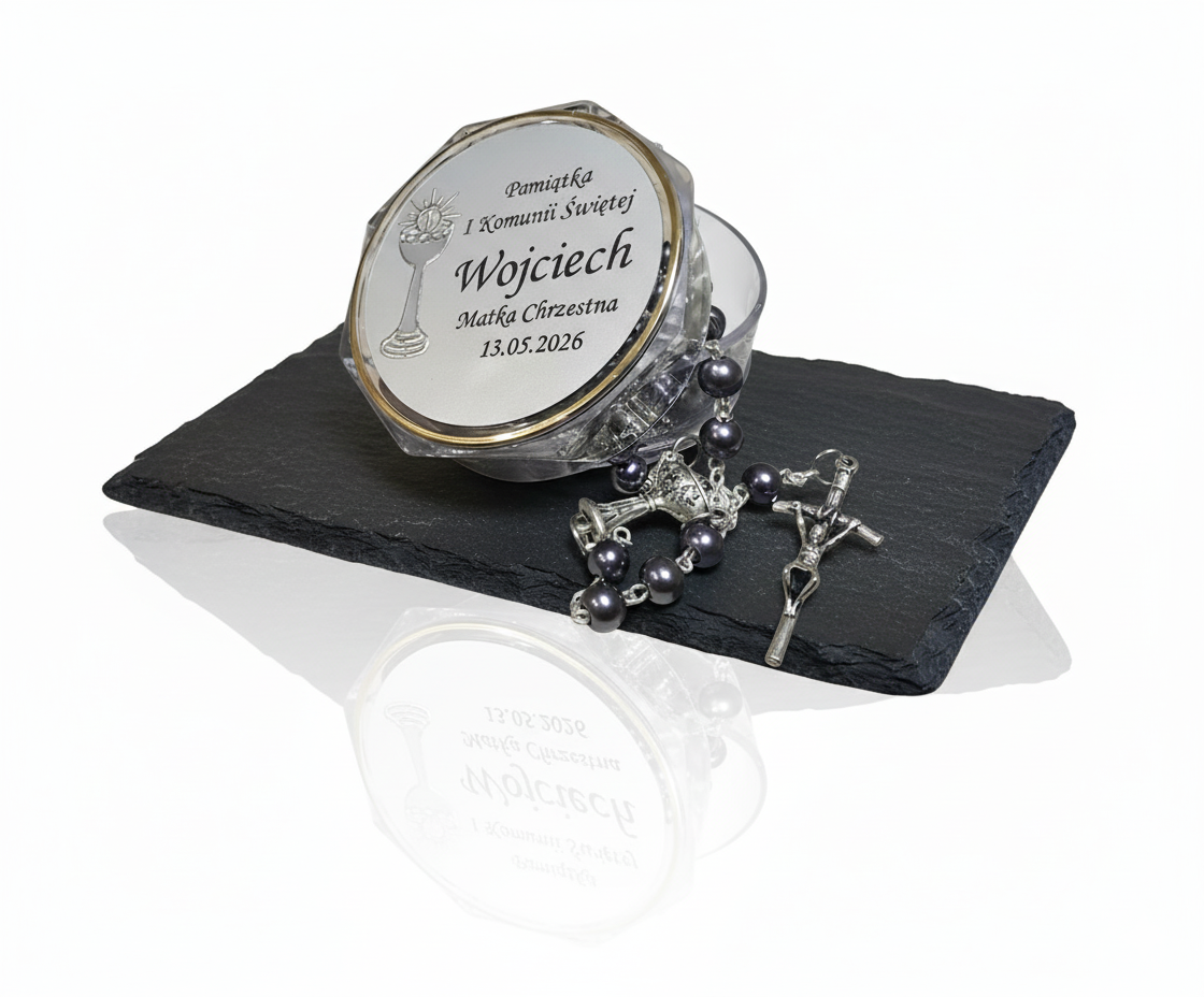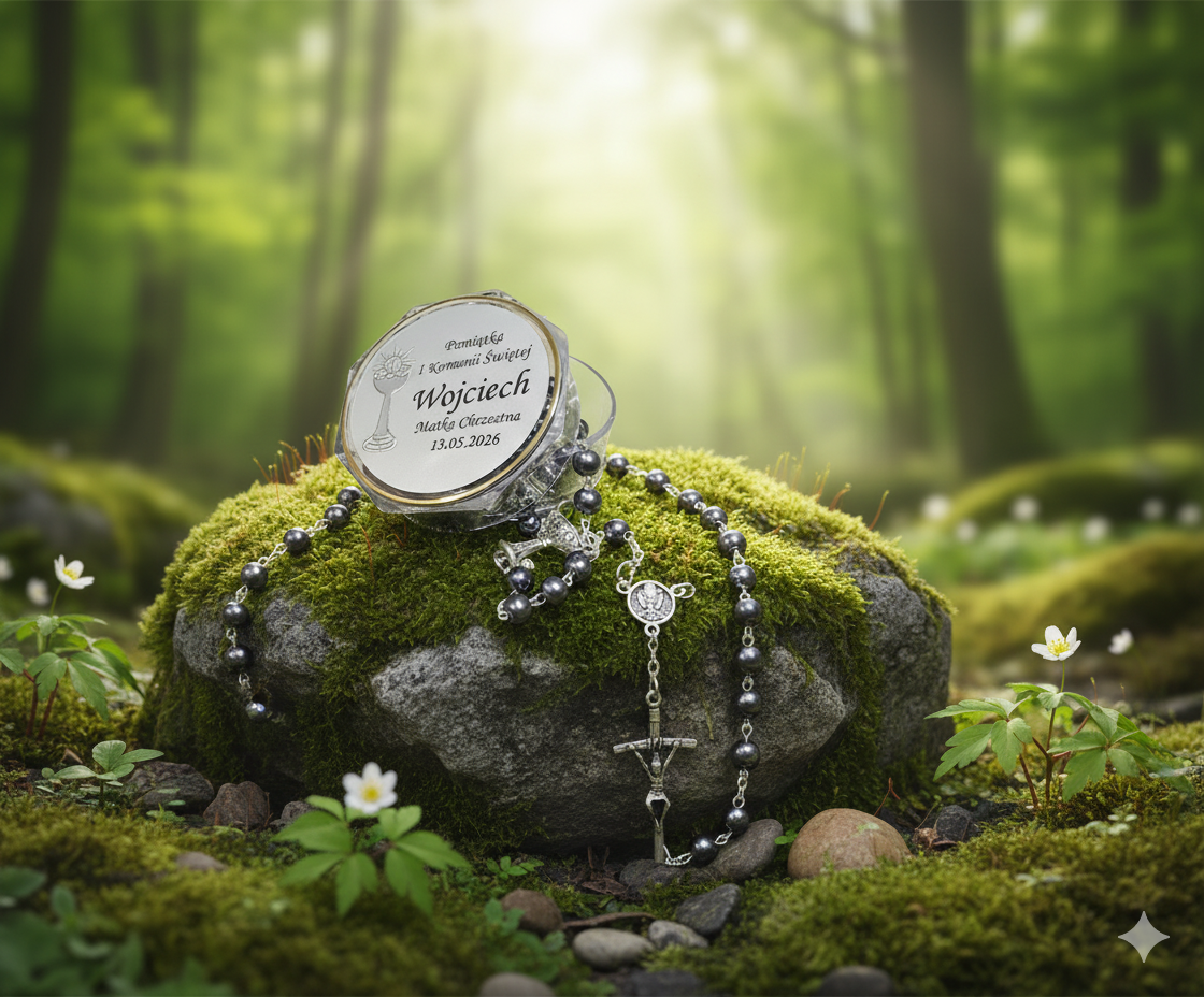 Niech różaniec z grawerowanym pudełkiem będzie trwałą pamiątką pierwszego spotkania z Jezusem – pełną światła, siły i pokoju.