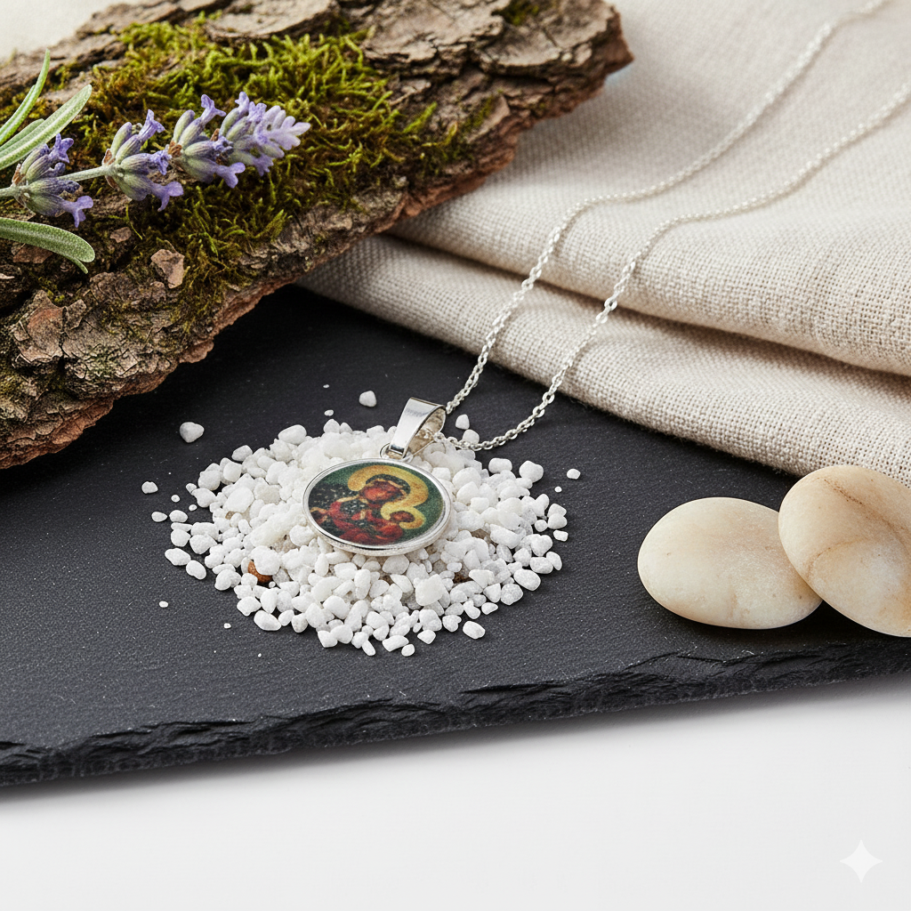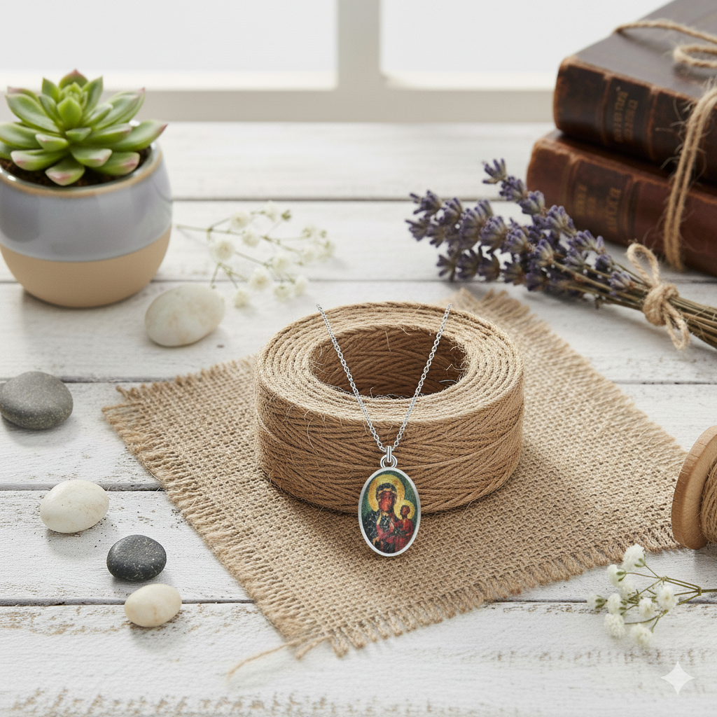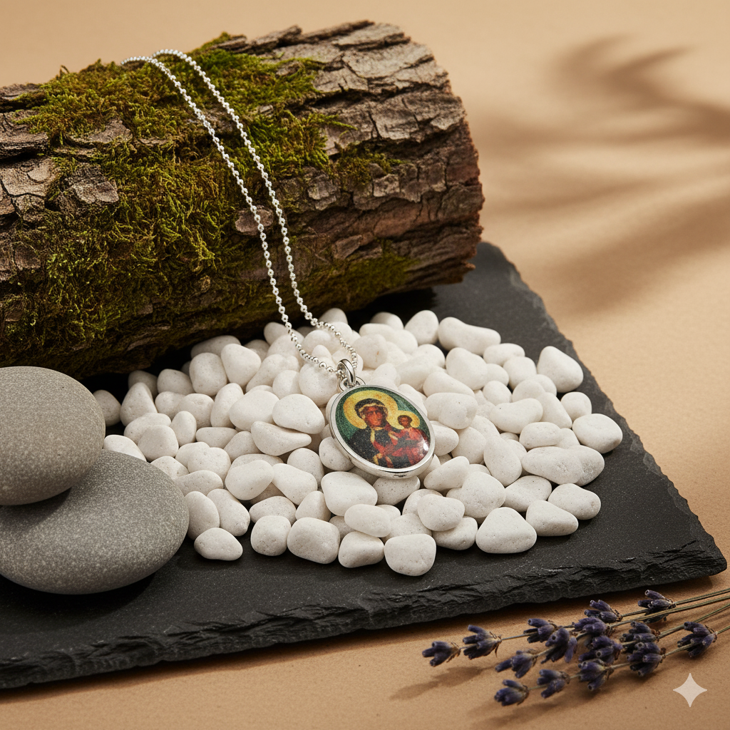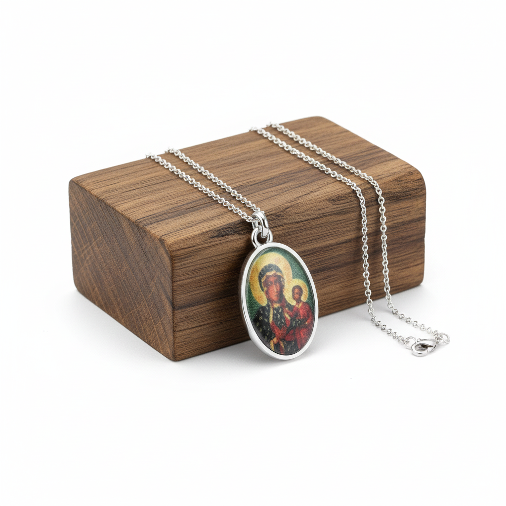 Ten wyjątkowy komplet biżuterii religijnej łączy w sobie elegancję srebra i głębokie znaczenie duchowe. Medalik z wizerunkiem Matki Boskiej Częstochowskiej to jeden z najbardziej rozpoznawalnych symboli polskiej wiary. Inspiracją dla jego powstania był cudowny obraz Matki Boskiej Jasnogórskiej, otaczany czcią zarówno przez wiernych Kościoła katolickiego, jak i prawosławnego.