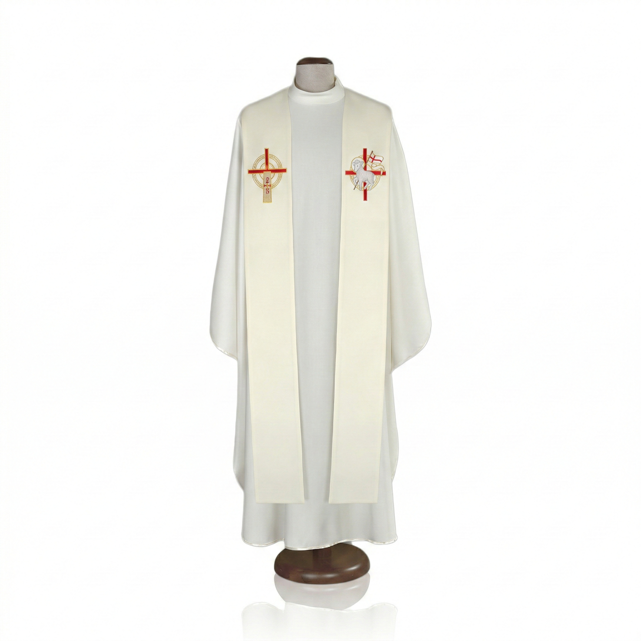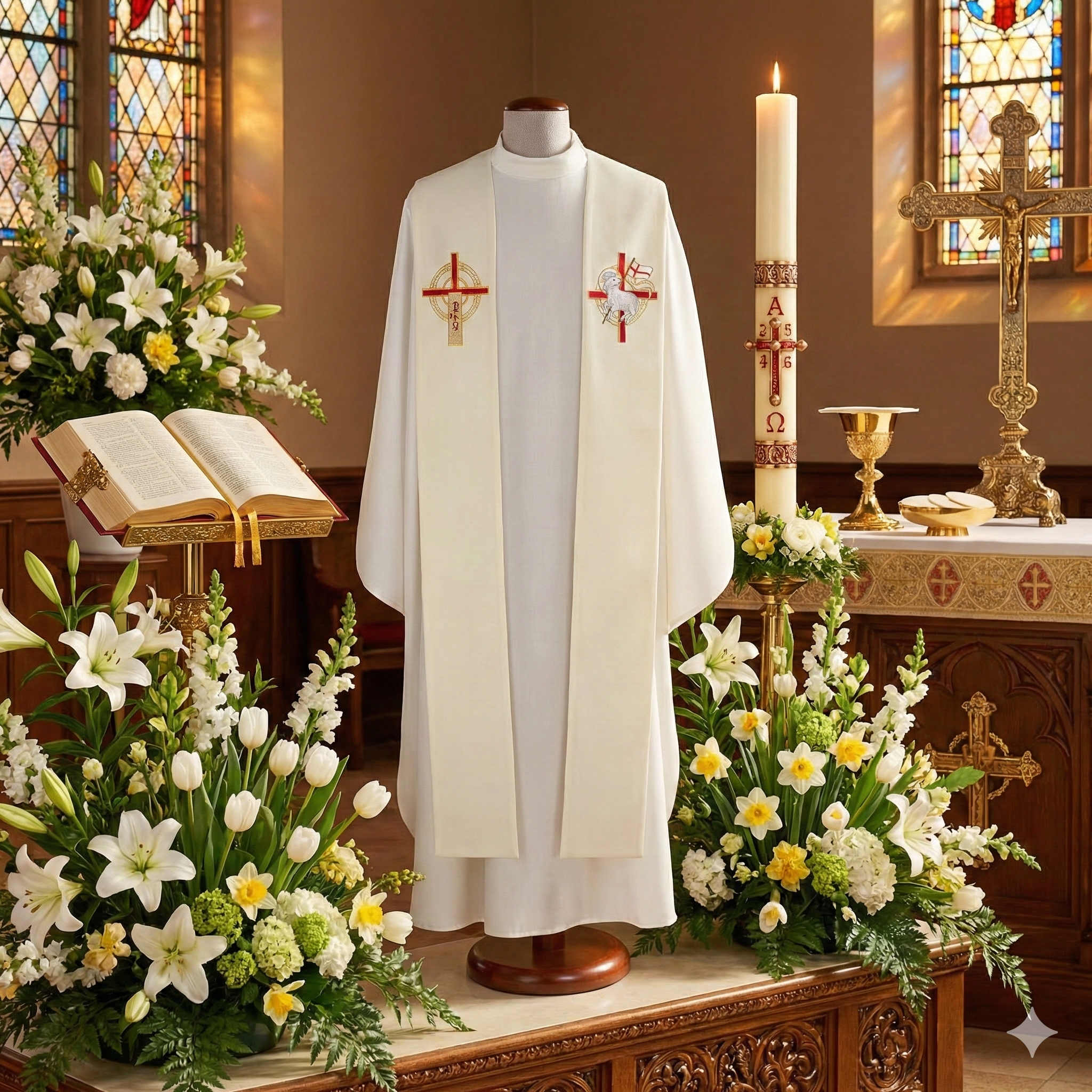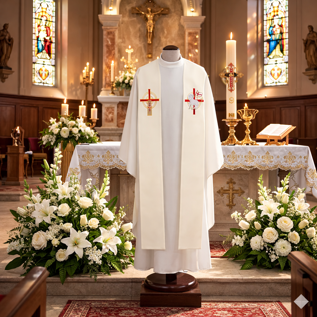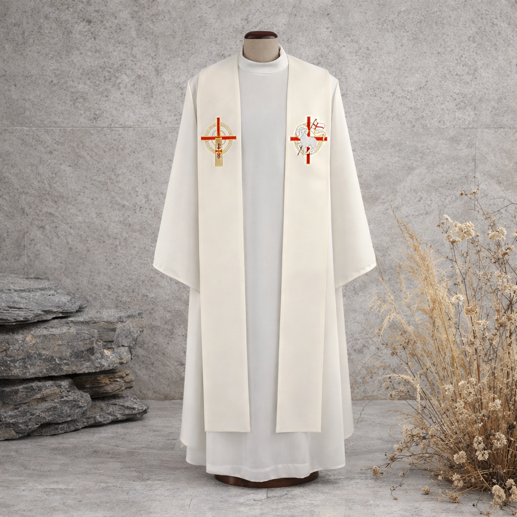 Stuła ozdobiona jest haftowaną symboliką wielkanocną – motywem krzyża oraz Baranka Paschalnego. Elementy w tonacji złota i czerwieni podkreślają zwycięstwo Chrystusa nad śmiercią oraz radość okresu paschalnego.