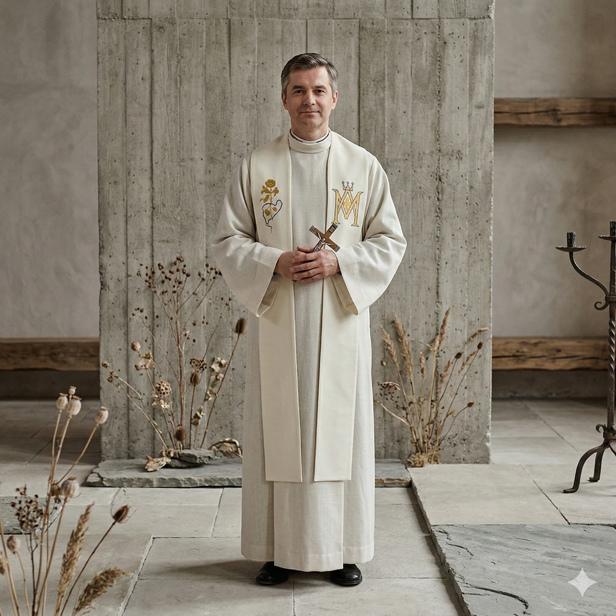 Stuła wykonana została z lekkiej, dobrze układającej się tkaniny liturgicznej w odcieniu ecru. Połączenie złotych i niebieskich nici nadaje haftowi delikatny, maryjny charakter, zachowując przy tym pełną czytelność symboliki.