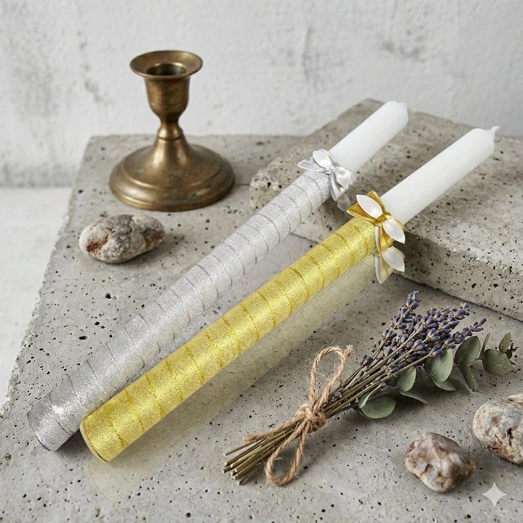 Elegancka gromnica pamiątkowa w kolorze srebra lub złota, zdobiona ręcznie. Symbol światła, wiary i odrodzenia – idealna świeca na Chrzest lub Komunię Świętą. Polska jakość i rzemieślnicza precyzja w wyjątkowej formie.