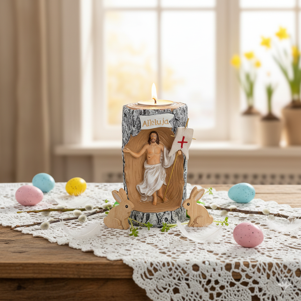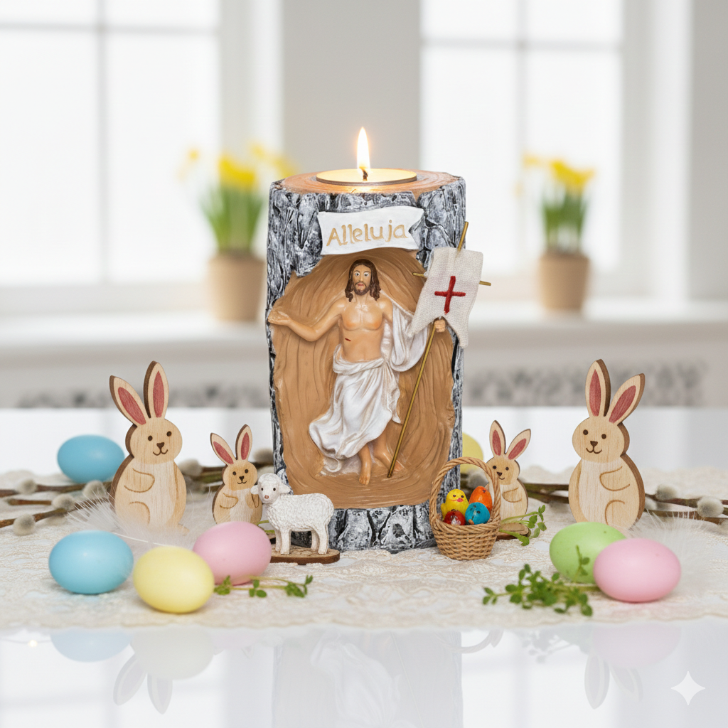 Kompaktowy świecznik wielkanocny z figurą Jezusa Zmartwychwstałego (8 cm) to subtelny symbol zwycięstwa życia nad śmiercią. Idealny do małych stroików, koszyczka wielkanocnego i domowego kącika modlitwy.