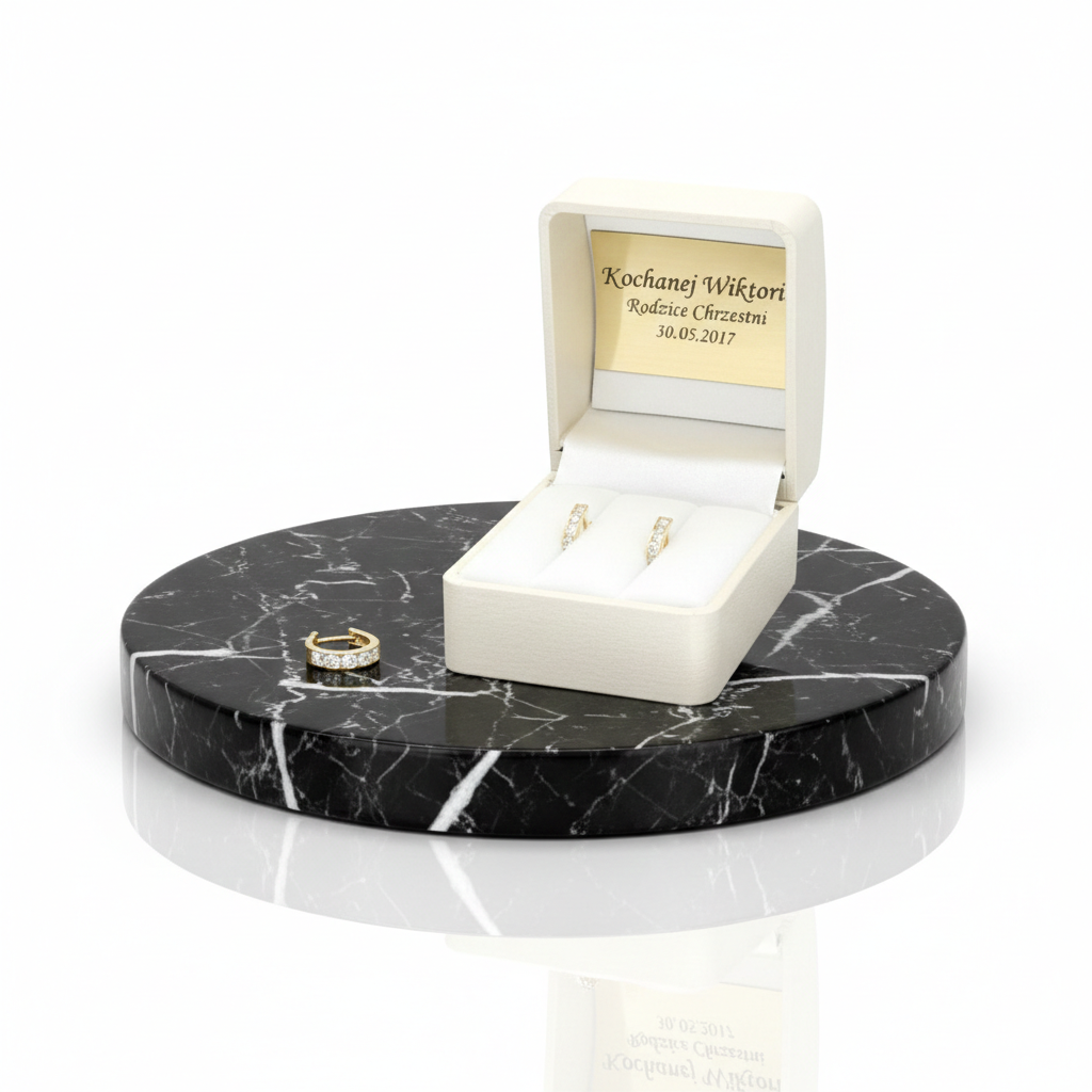 Delikatne złote kolczyki próby 585 z cyrkoniami, wykonane w formie klasycznych kolczyków z angielskim zapięciem. Zapakowane w eleganckie pudełeczko z możliwością personalizowanej dedykacji, stanowią wyjątkową pamiątkę Chrztu Świętego, Roczku lub ważnej uroczystości rodzinnej.