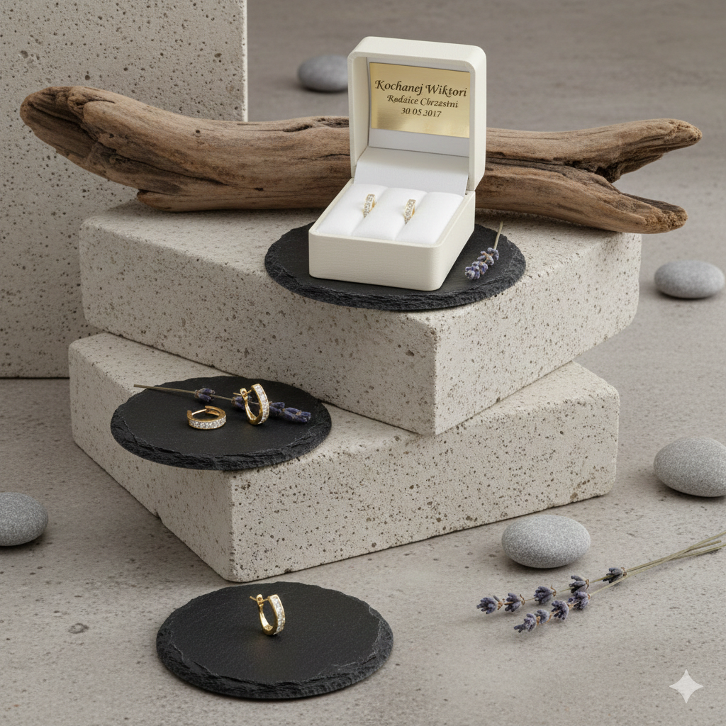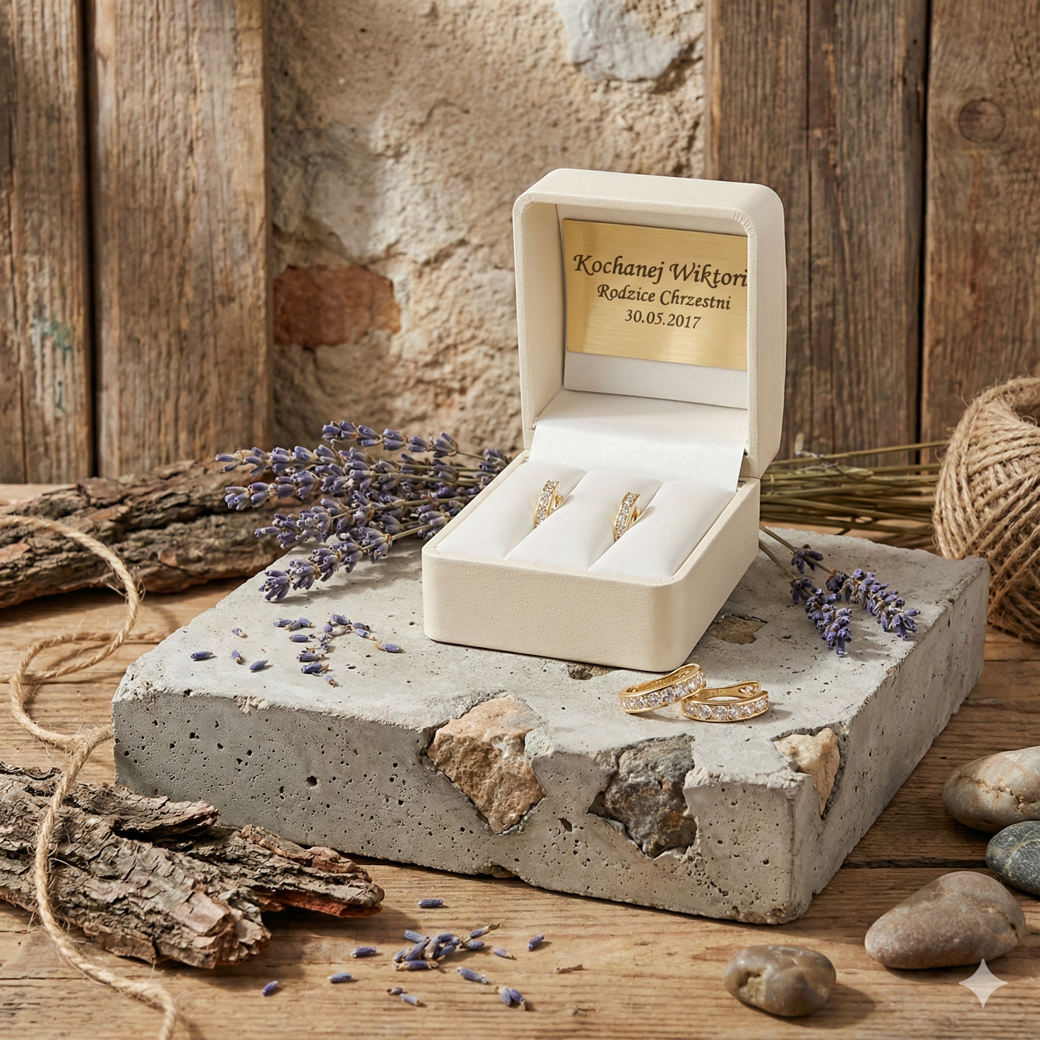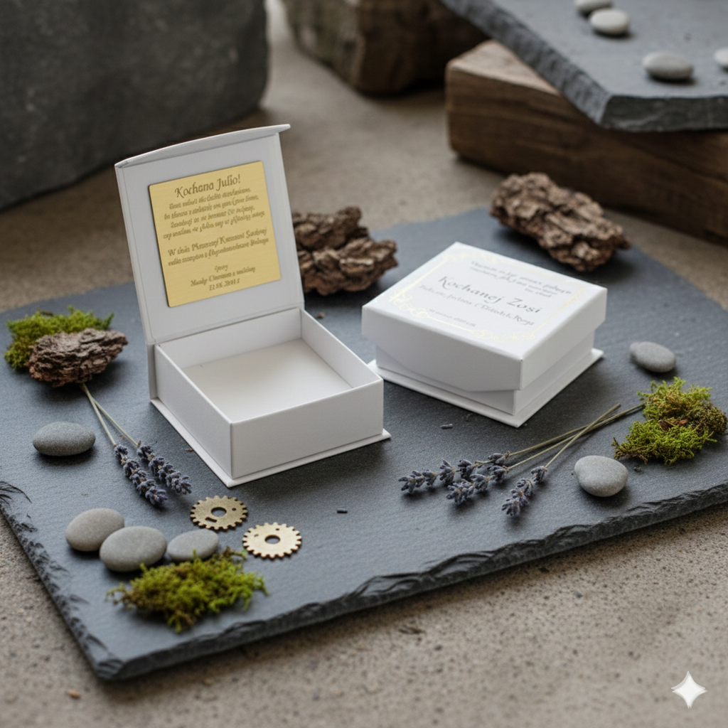 - Grawer laserowy na laminowanej tabliczce wewnątrz pudełka,