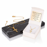 Złoty komplet biżuterii Krzyż & Serce wykonany z żółtego złota próby 585 to wyjątkowa pamiątka wiary i miłości. Wisiorek z delikatnym sercem wpisanym w krzyż, łańcuszek oraz eleganckie pudełeczko z indywidualną dedykacją tworzą ponadczasowy prezent na Chrzest Święty lub Pierwszą Komunię Świętą.