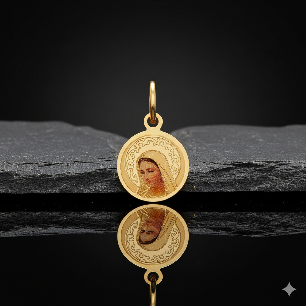 Nowoczesny ażurowy kształt medalika nadaje całości lekkości i subtelności, a emaliowany wizerunek podkreśla wyjątkowy charakter biżuterii, łącząc tradycyjną symbolikę z elegancką formą jubilerską.