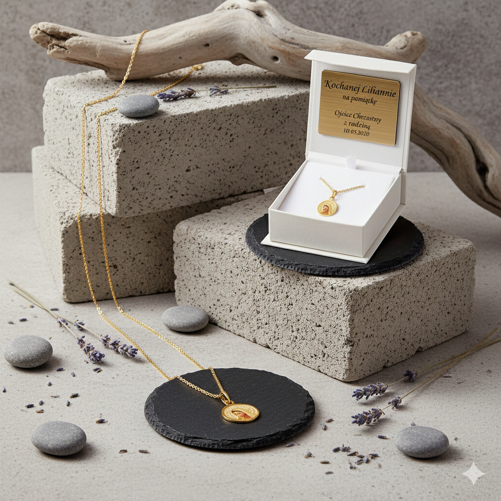 - Komplet: medalik i łańcuszek w spójnej stylistyce,