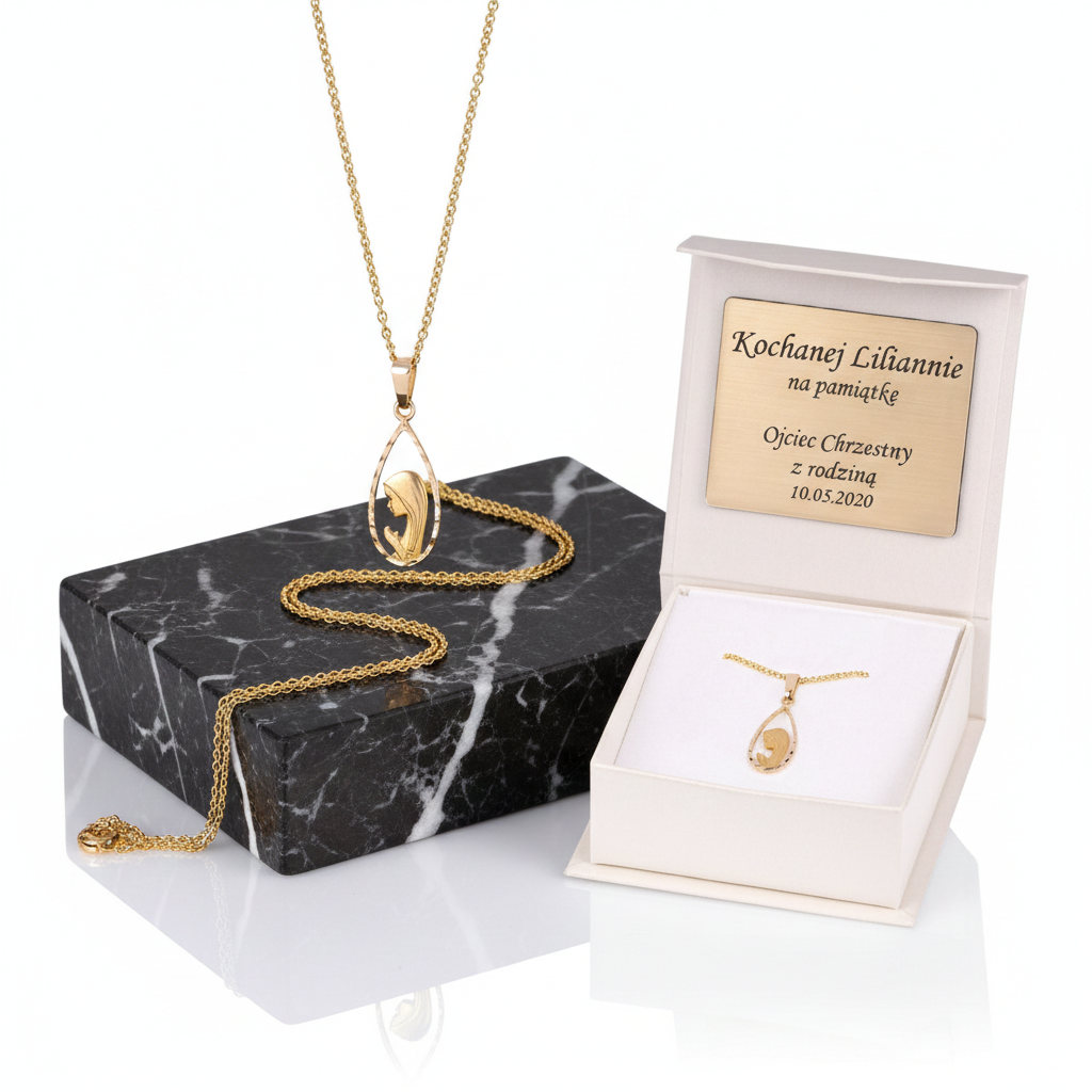 Złoty medalik Matki Boskiej Fatimskiej w nowoczesnym kształcie łezki, wykonany z żółtego złota próby 585, to subtelna i głęboko symboliczna pamiątka Chrztu Świętego lub Pierwszej Komunii Świętej. Komplet z łańcuszkiem, zapakowany w eleganckie pudełeczko z indywidualną dedykacją, stanowi wyjątkowy prezent na całe życie.