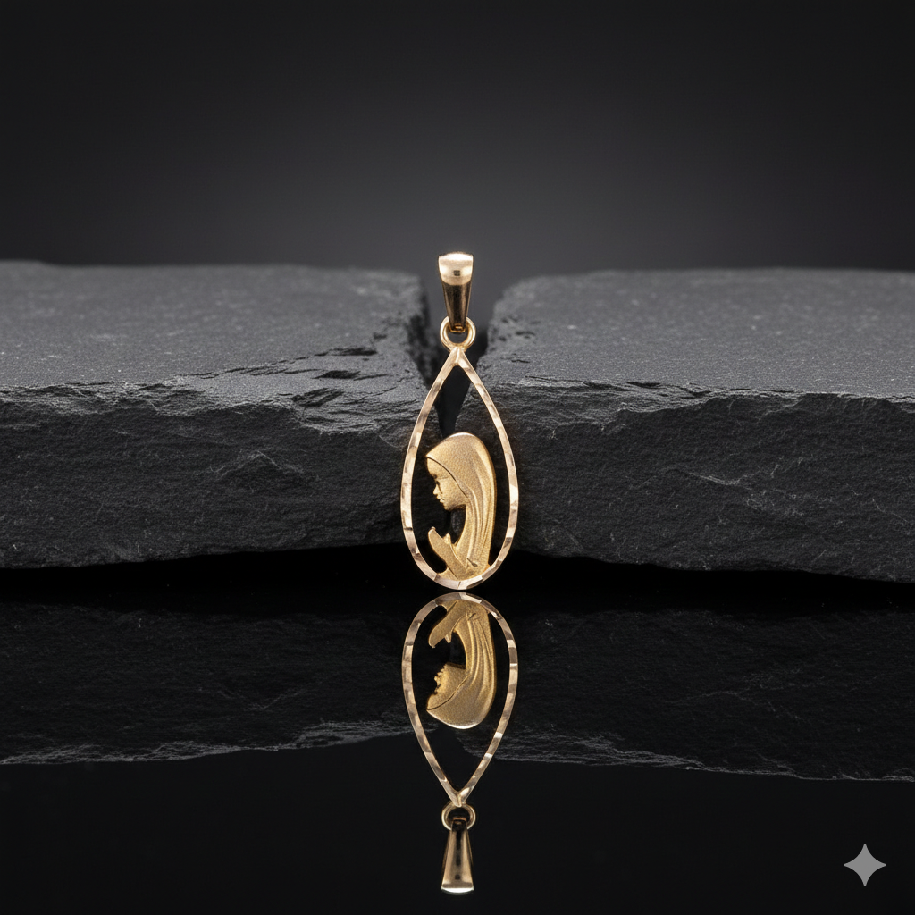 Nowoczesny kształt łezki nadaje medalikowi wyjątkowej delikatności. Forma ta symbolizuje czułość, duchowe wzruszenie i modlitwę płynącą z serca, czyniąc biżuterię osobistym znakiem wiary i opieki Maryi.