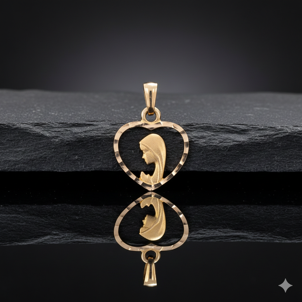 Medalik w kształcie serca podkreśla miłość, opiekę i duchową bliskość Matki Bożej. Delikatna sylwetka Maryi umieszczona wewnątrz serca czyni ten medalik osobistym znakiem wiary, nadziei i ochrony.