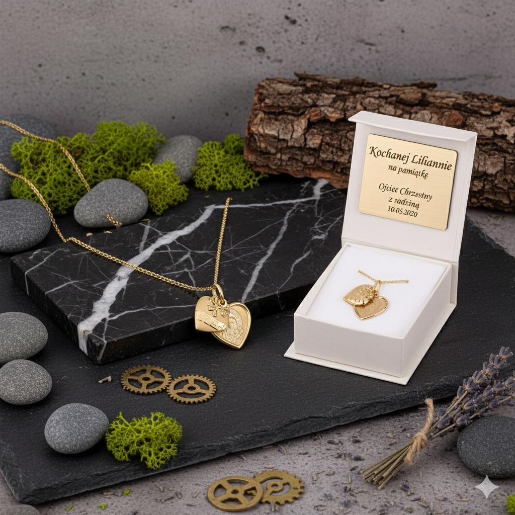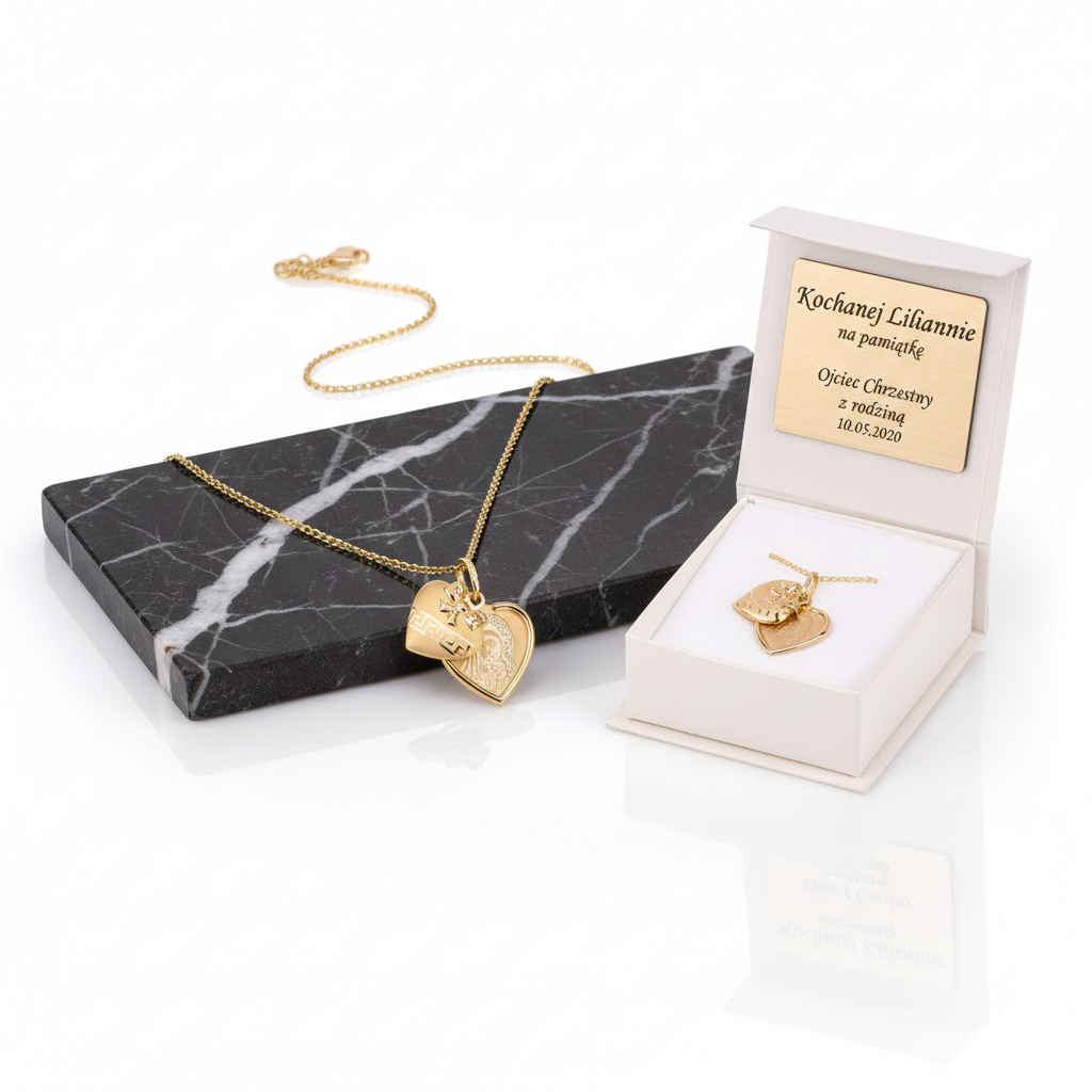 Złoty, otwierany medalik w kształcie serca z wizerunkiem Matki Boskiej z Dzieciątkiem, wykonany z żółtego złota próby 585. Komplet z łańcuszkiem oraz personalizowaną dedykacją stanowi elegancką i trwałą pamiątkę Pierwszej Komunii Świętej.