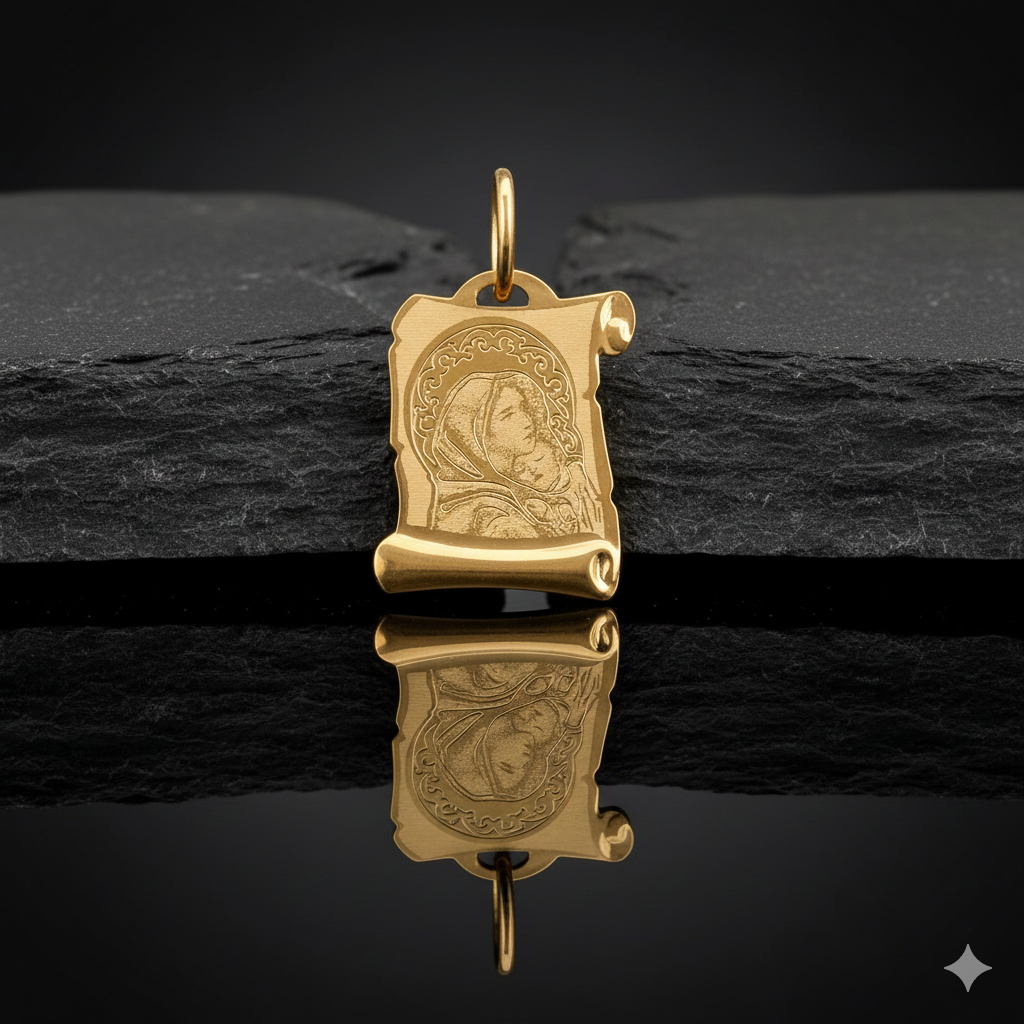 Medalik w formie papirusu z wizerunkiem Matki Boskiej z Dzieciątkiem nawiązuje do starożytnych zapisów wiary i tradycji chrześcijańskiej przekazywanej z pokolenia na pokolenie. Forma zwiniętego papirusu symbolizuje trwałość przesłania, opiekę oraz duchowe dziedzictwo.
