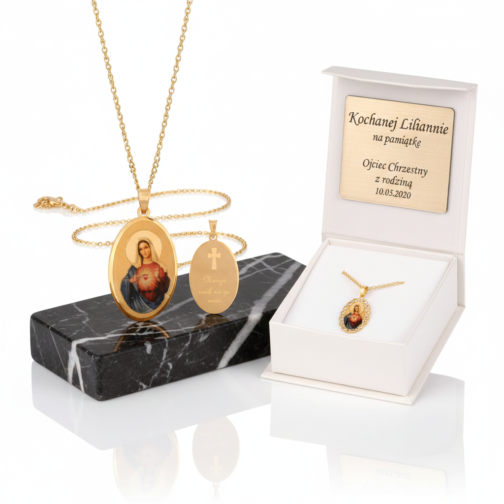 Symboliczny złoty medalik z wizerunkiem Niepokalanego Serca Maryi, wykonany z żółtego złota próby 585, to wyjątkowa pamiątka Chrztu Świętego oraz Pierwszej Komunii Świętej. Komplet zapakowany w eleganckie pudełeczko z dedykacją grawerowaną laserowo tworzy osobisty prezent na całe życie.